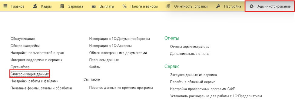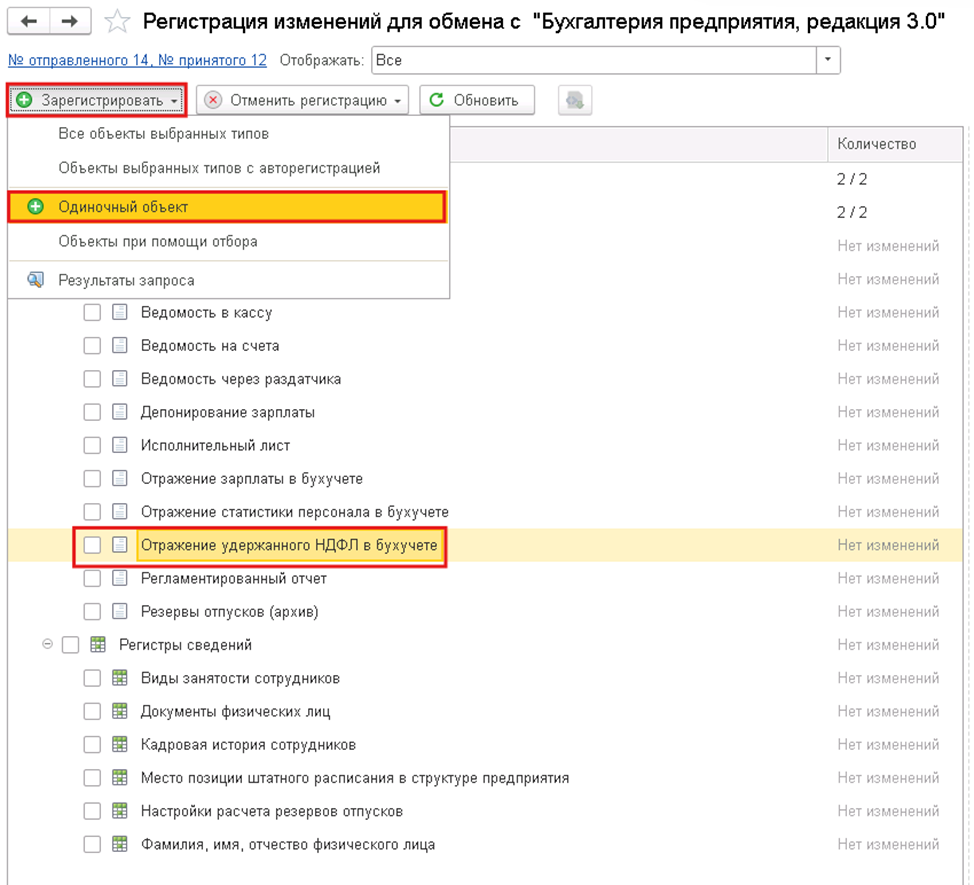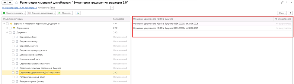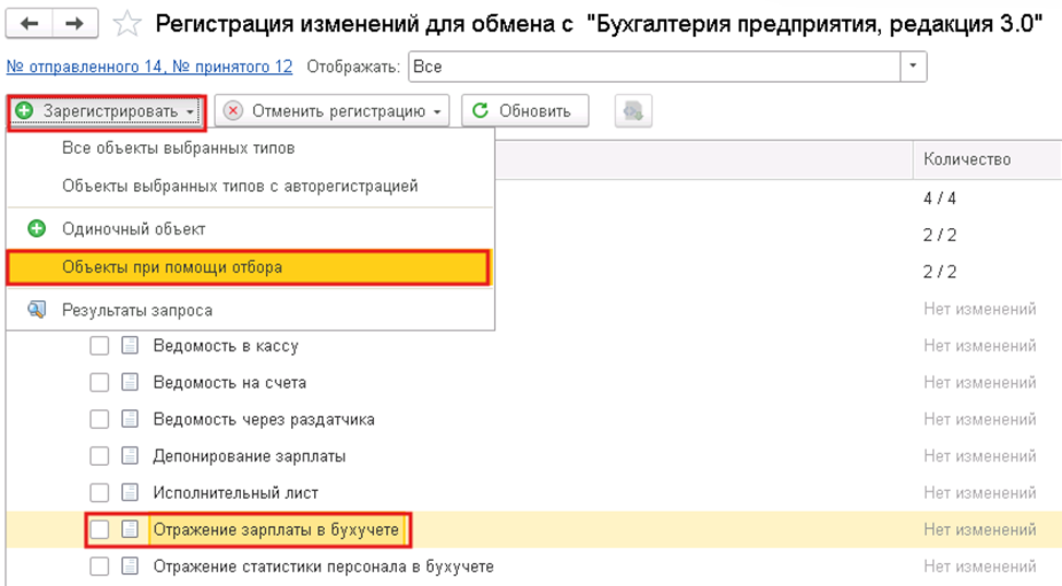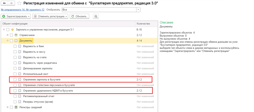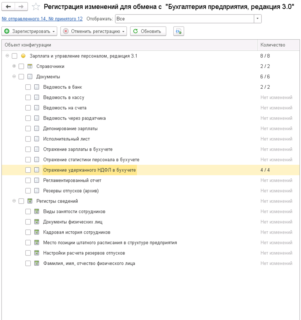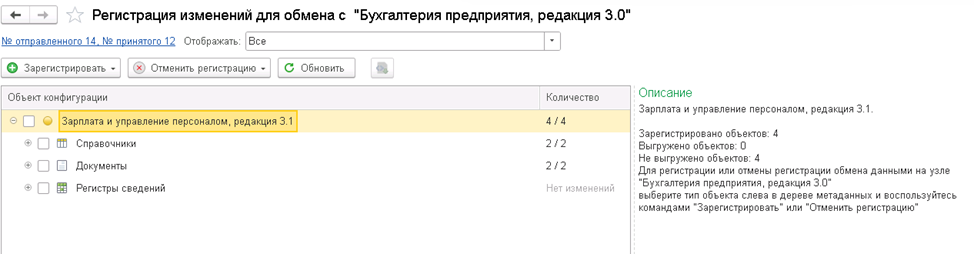 На этой странице отображаются объекты, участвующие в обмене данными. Например: в конфигурации «Зарплата и управление персоналом, редакция 3.1», это «Справочники», «Документы» и «Регистры сведений». Для каждого объекта указывается количество новых документов и зарегистрированных к выгрузке элементов.