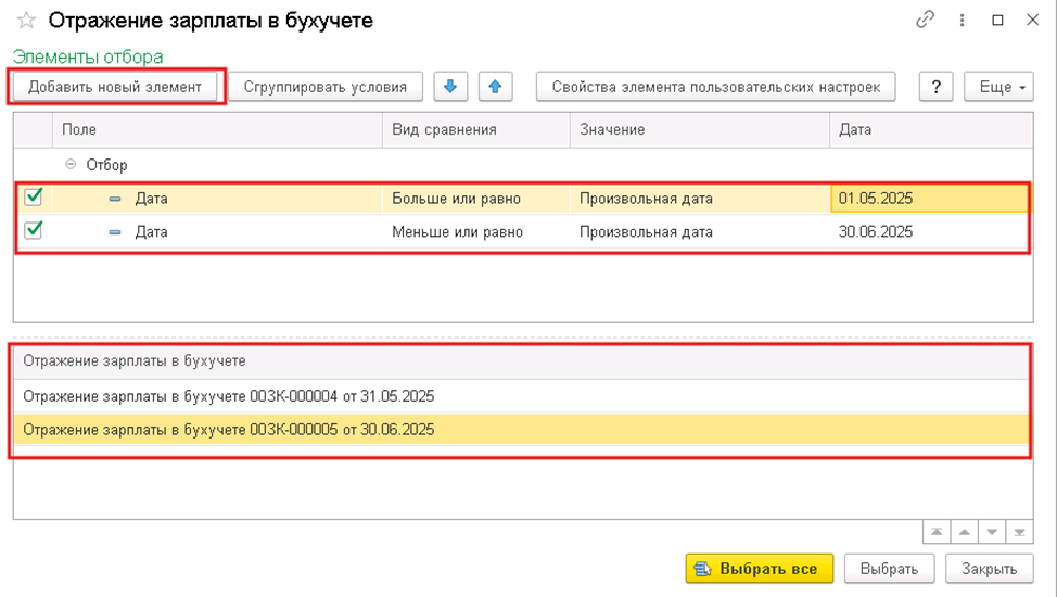 В этом случае откроется окно, где вы можете настроить отбор для поиска нужных документов. Обычно используется отбор по дате документа. Например, если нужны документы за май и июнь 2025 года:
