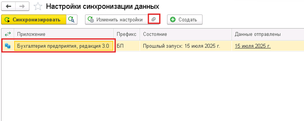 Если в вашей базе настроено несколько синхронизаций с разными базами, выберите нужную настройку и нажмите кнопку с изображением двух квадратов. Она расположена рядом с кнопкой «Изменить настройки» и служит для просмотра состава отправляемых данных.