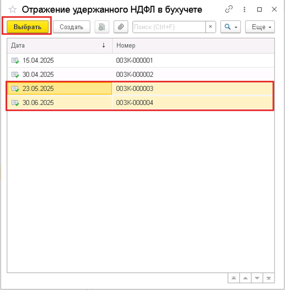 У вас откроется окно со списком документов «Отражение удержанного НДФЛ». В этом окне необходимо выбрать нужные документы. Чтобы выбрать несколько документов одновременно, удерживайте клавишу CTRL на клавиатуре и щёлкайте курсором по нужным строкам.
