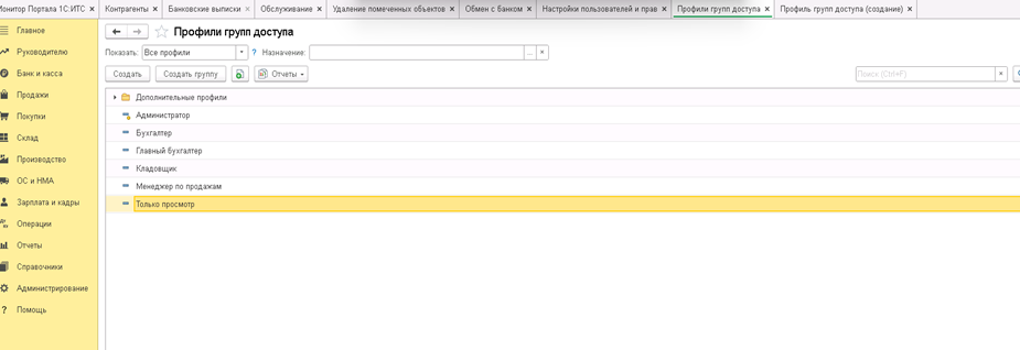 Иногда возникает задача добавить пользователя для просмотра отчетов и документов, но при этом разрешить печатать и сохранять данные во внешние файлы. Первую задачу можно решить ролью «Просмотр», но для возможности сохранения и вывода на печать нужно создать дополнительный Профиль групп доступа.