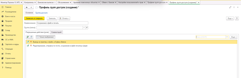 Разрешенные действия(роли) для профиля групп доступа Сохранение в файл и печать.