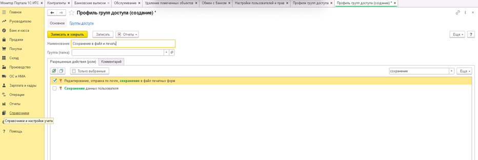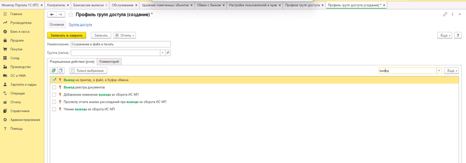 Добавление прав пользователю 1С на сохранение, вывод в файл печатных форм