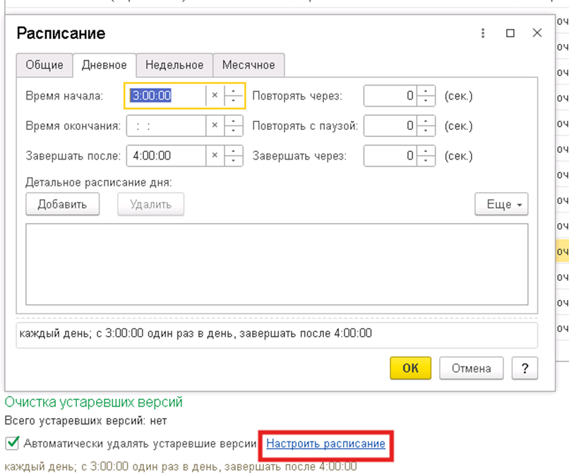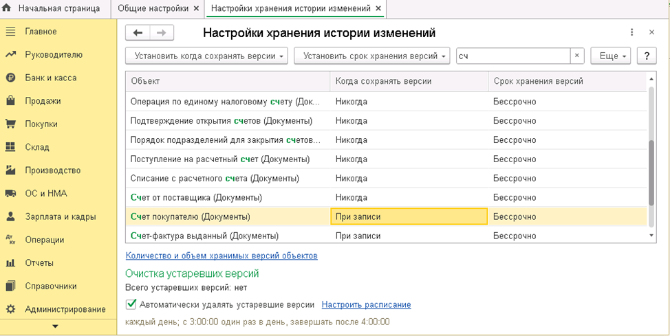 Чтобы старые версии удалялись автоматически по истечении срока, найдите в настройках и активируйте регламентное задание "Автоматически удалять устаревшие версии" или настройте его расписание.