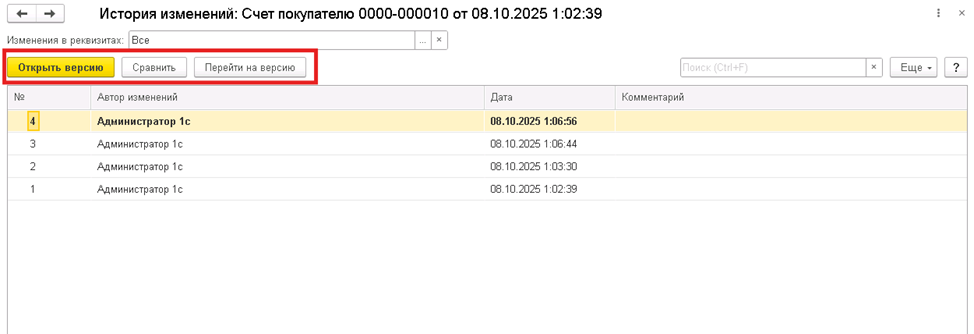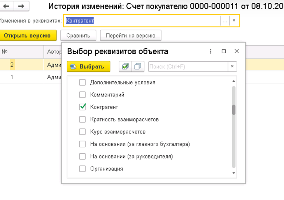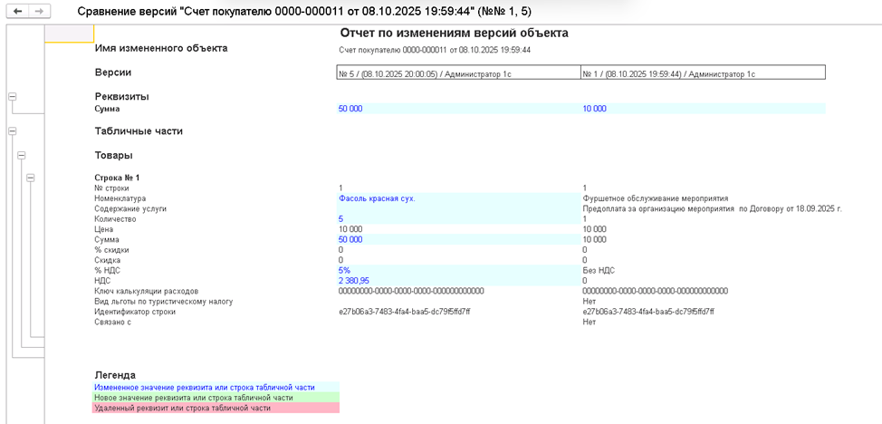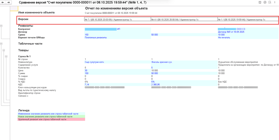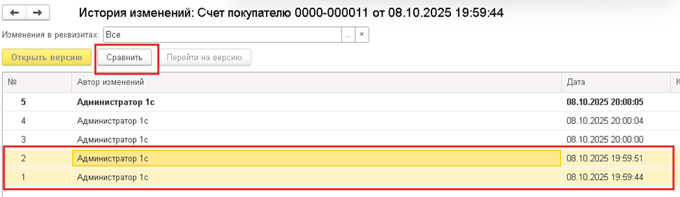 3. Анализ и сравнение. Функция «Сравнить» наглядно показывает, какие именно реквизиты были изменены между двумя любыми версиями объекта.