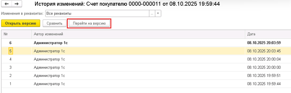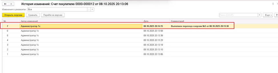 2. Восстановление данных после ошибок. При случайном или ошибочном изменении вы можете выполнить «Переход на версию» — то есть вернуть объект (документ или элемент справочника) к его предыдущему корректному состоянию.