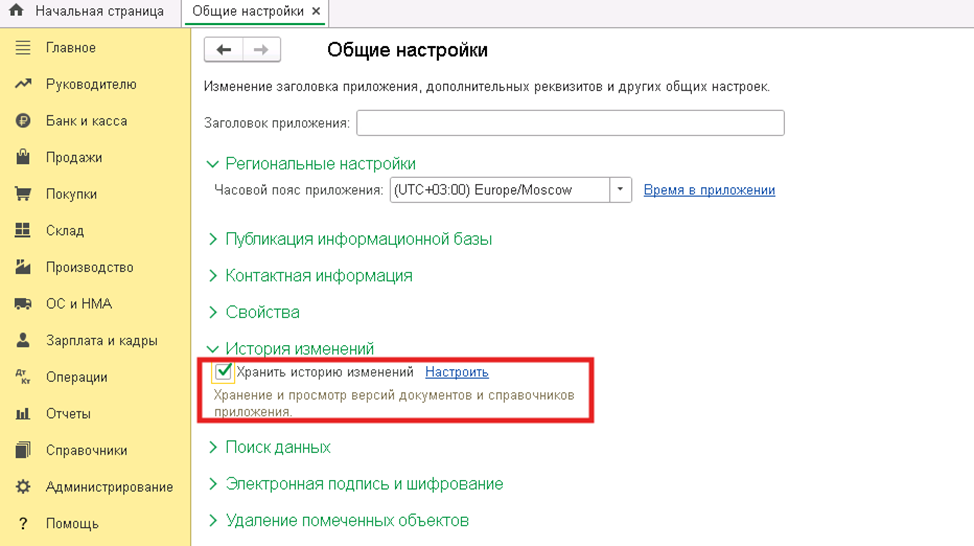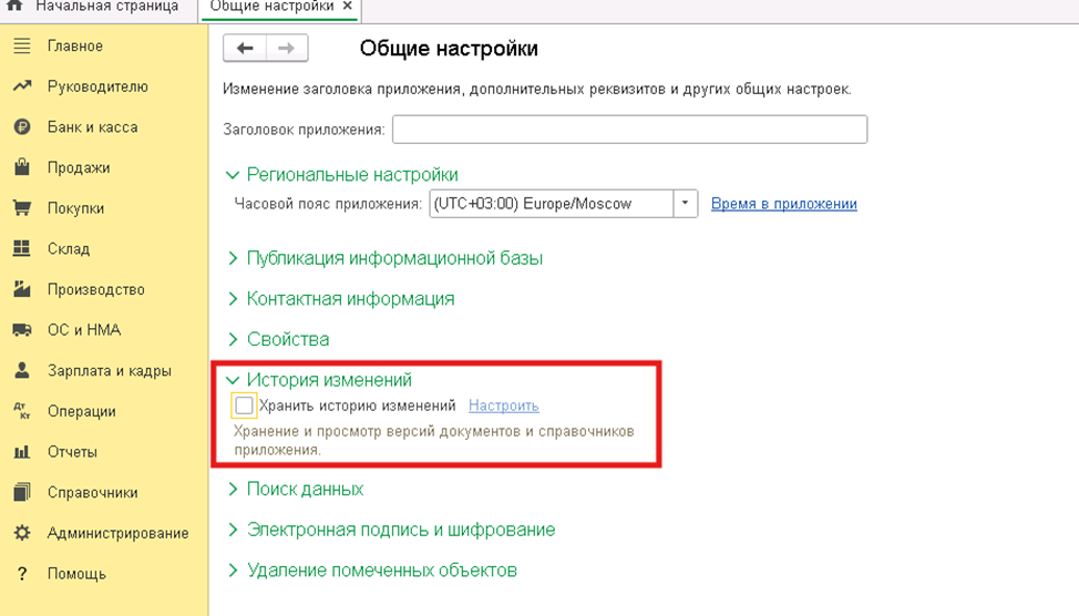 Версионирование — это встроенный механизм в 1с, который автоматически сохраняет версии данных при каждом их изменении. Он позволяет отслеживать, кто, когда и какие именно изменения вносил в документы и справочники, а при необходимости - откатывать нежелательные правки. Пошаговая инструкция по включению версионирования Чтобы активировать и настроить ведение истории изменений, выполните следующие шаги: Откройте настройки истории изменений Перейдите в раздел "Администрирование". Выберите "Общие настройки". В открывшейся форме найдите и кликните на ссылку "История изменений".