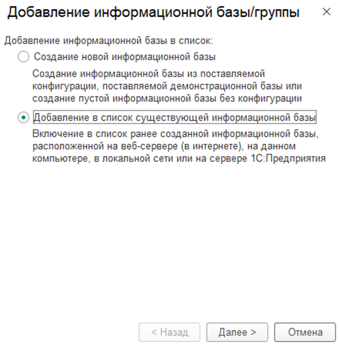 - Добавление в список существующей информационной базы — если база уже существует (например, её вам передали коллеги или она расположена на сервере), и вы хотите подключиться к ней.