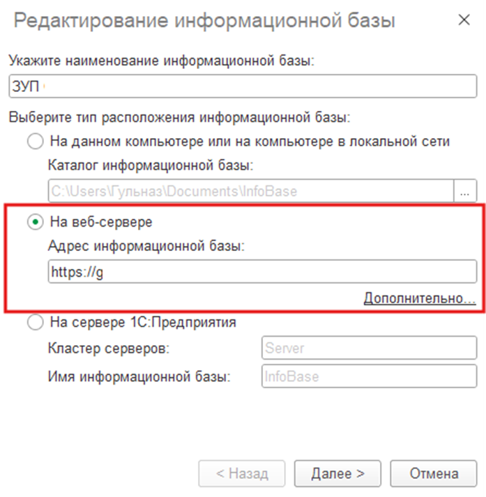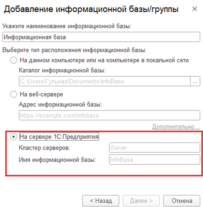 «Имя информационной базы в кластере» — укажите точное имя базы, под которым она зарегистрирована на сервере.