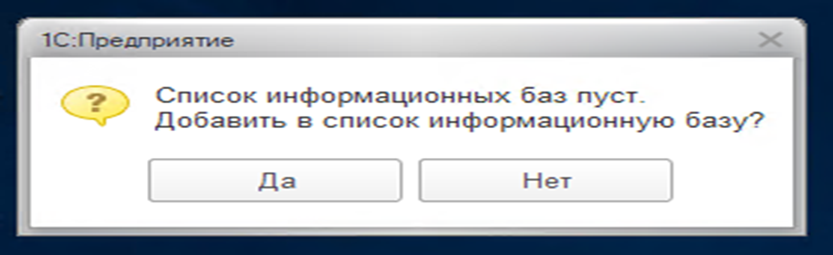 Если вы запускаете 1С впервые и список пуст, программа сама предложит добавить базу — нажмите «Да».