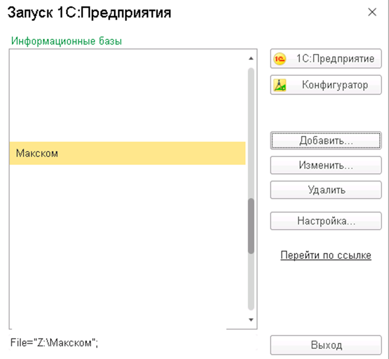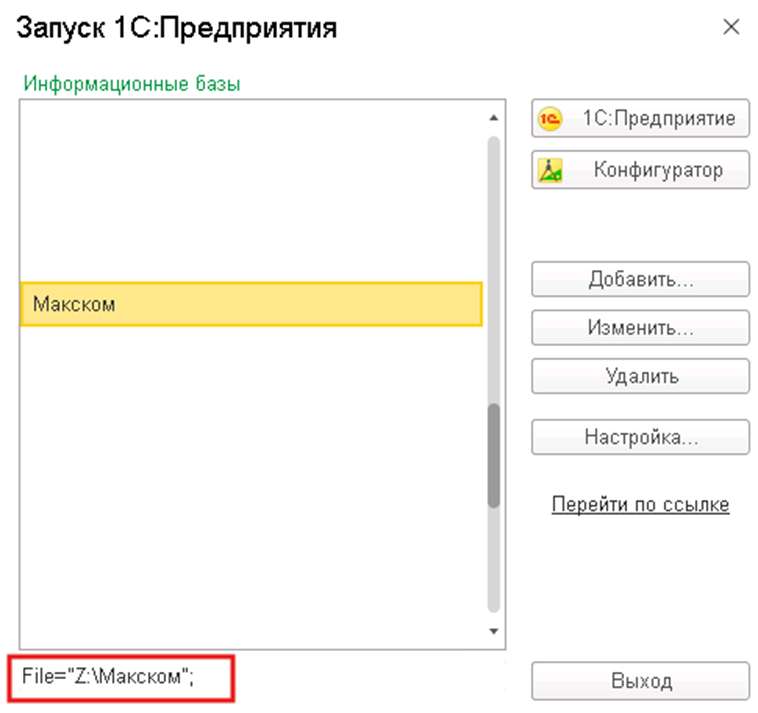 Если база является клиент-серверной, в нижней части окна отобразится не путь к папке, а строка подключения к серверу, например: Srvr="server1";Ref="Buhgalteriya"