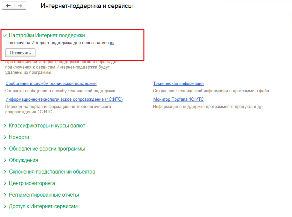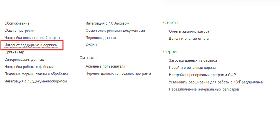 Способ 1. Проверить интернет-поддержку в программе 1С
