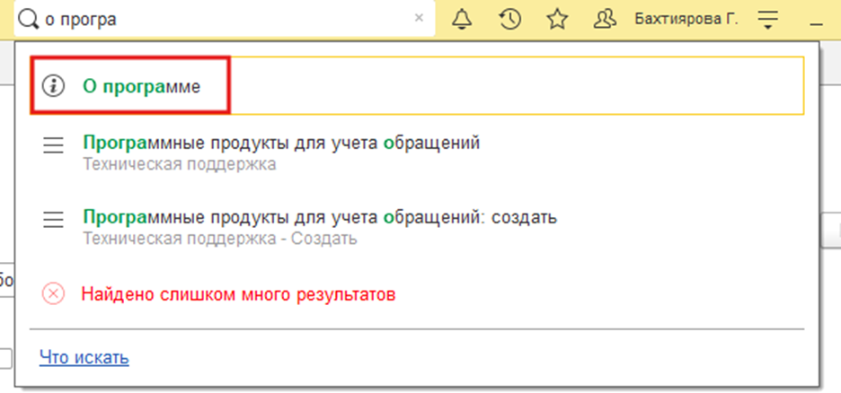 В современных версиях 1С можно быстро открыть окно «О программе» через глобальный поиск: