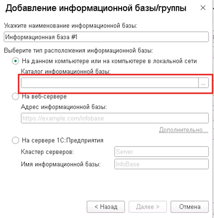 В поле «Каталог информационной базы» укажите путь к папке, где находится база: