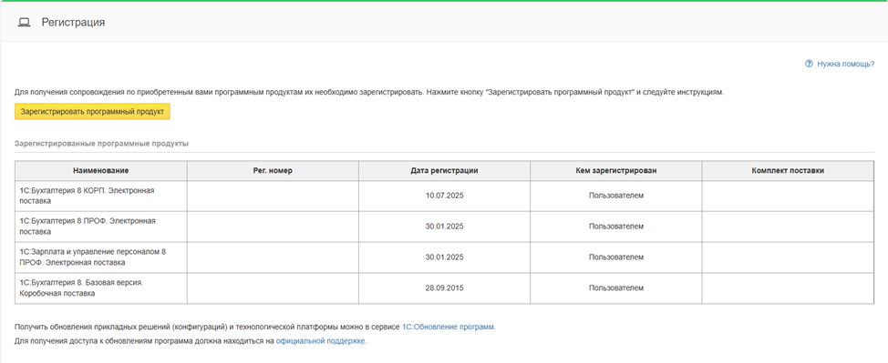 Перейдите в раздел «Программные продукты» - «Регистрация». Здесь отображаются все продукты, которые зарегистрированы на вашу организацию. Убедитесь, что в списке есть ваша конфигурация.