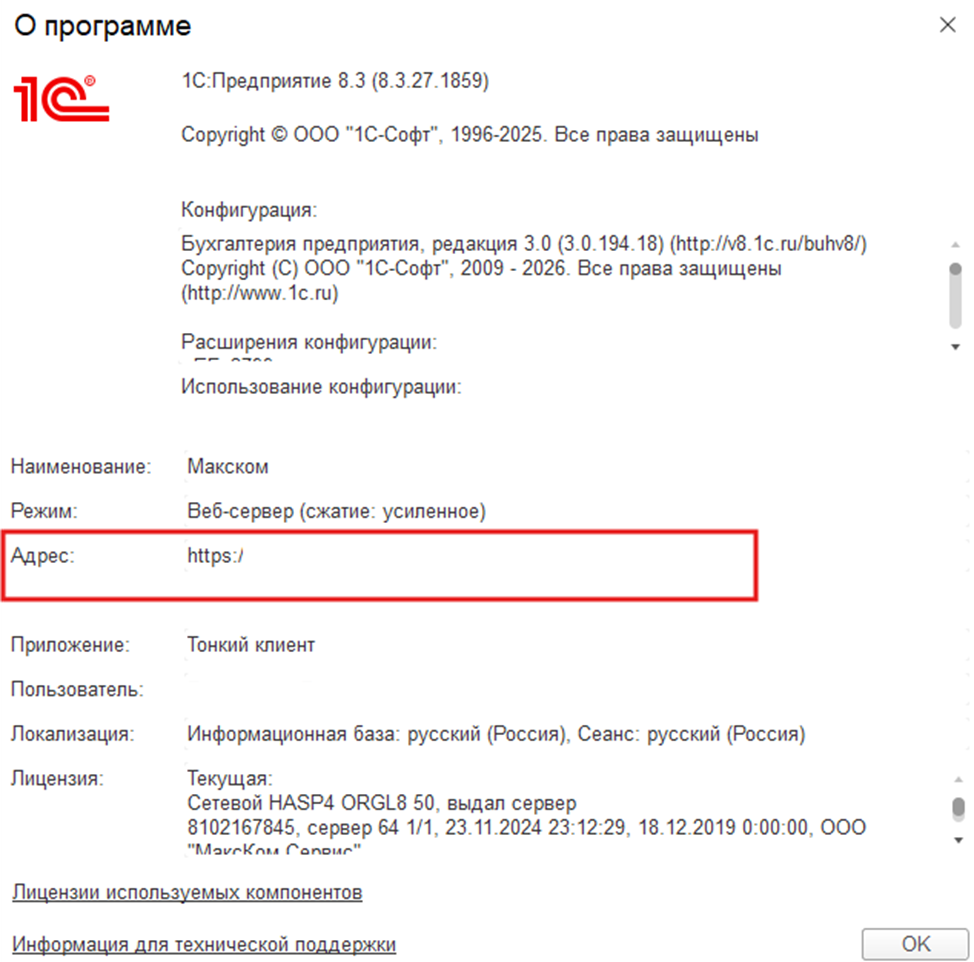 2.В открывшемся окне найдите строку: «Каталог информационной базы» (если у вас файловая база), «Адрес» (если база опубликованная) или «Сервер и имя базы» (если у вас серверная база) — там будет указан полный путь.
