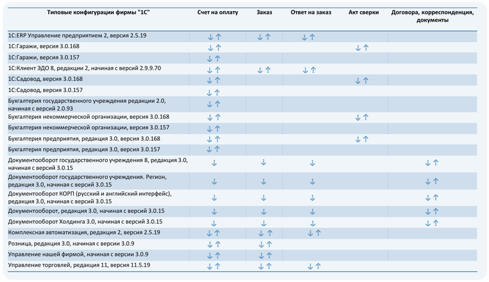 С помощью этого сервиса мы можем обмениваться документами по одной кнопке без использования ЭДО. Для этого не надо подключать ничего дополнительно, достаточно поддерживать вашу конфигурацию в актуальной версии. У контрагента даже может не быть 1С под рукой, он может открыть наш документ в браузере на компьютере или телефоне. Список поддерживаемых документов пока не велик, но будет пополняться: