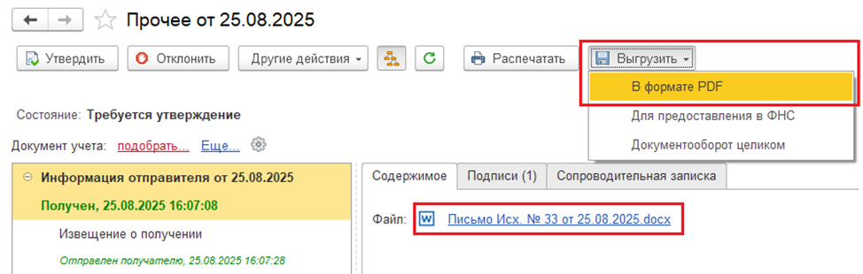 3) Во входящем письме открываем вложенный файл либо через функцию Выгрузить – В формате PDF, либо щелкнув непосредственно по названию файла