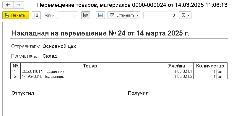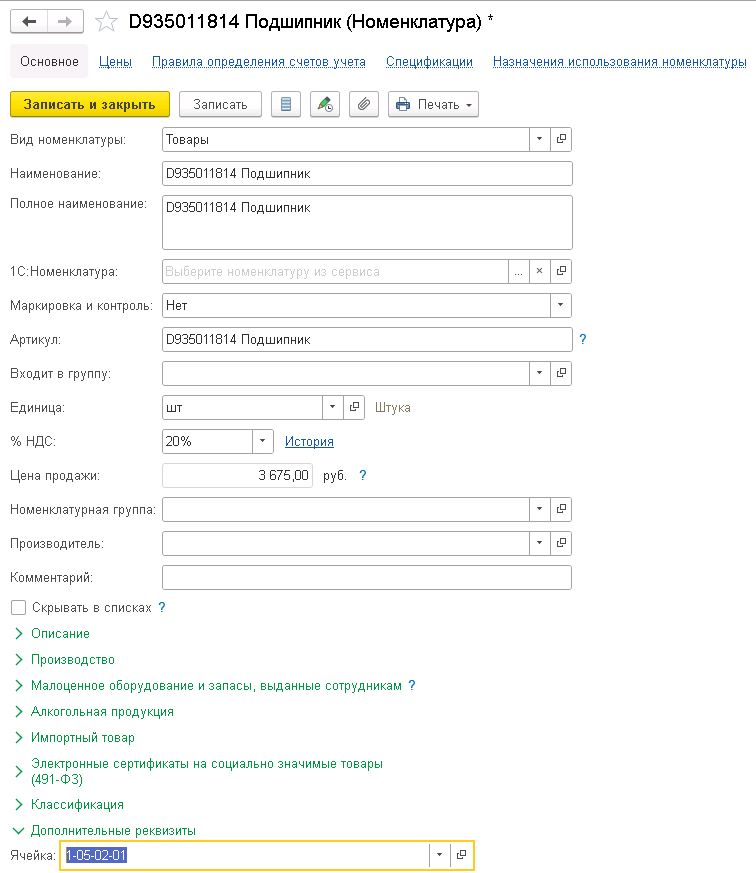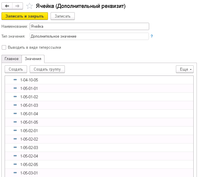 Подумали и предложили следующий вариант: в номенклатуре создаём дополнительный реквизит «Ячейка» с типом «Дополнительное значение». В каждой номенклатуре нужно указать ячейку, в которой будет храниться этот товар. Мы вывели этот реквизит в отчёт по остаткам товаров на складе и добавили его в печатные формы перемещения, поступления и реализации товаров, а также в несколько его доработанных отчетов.